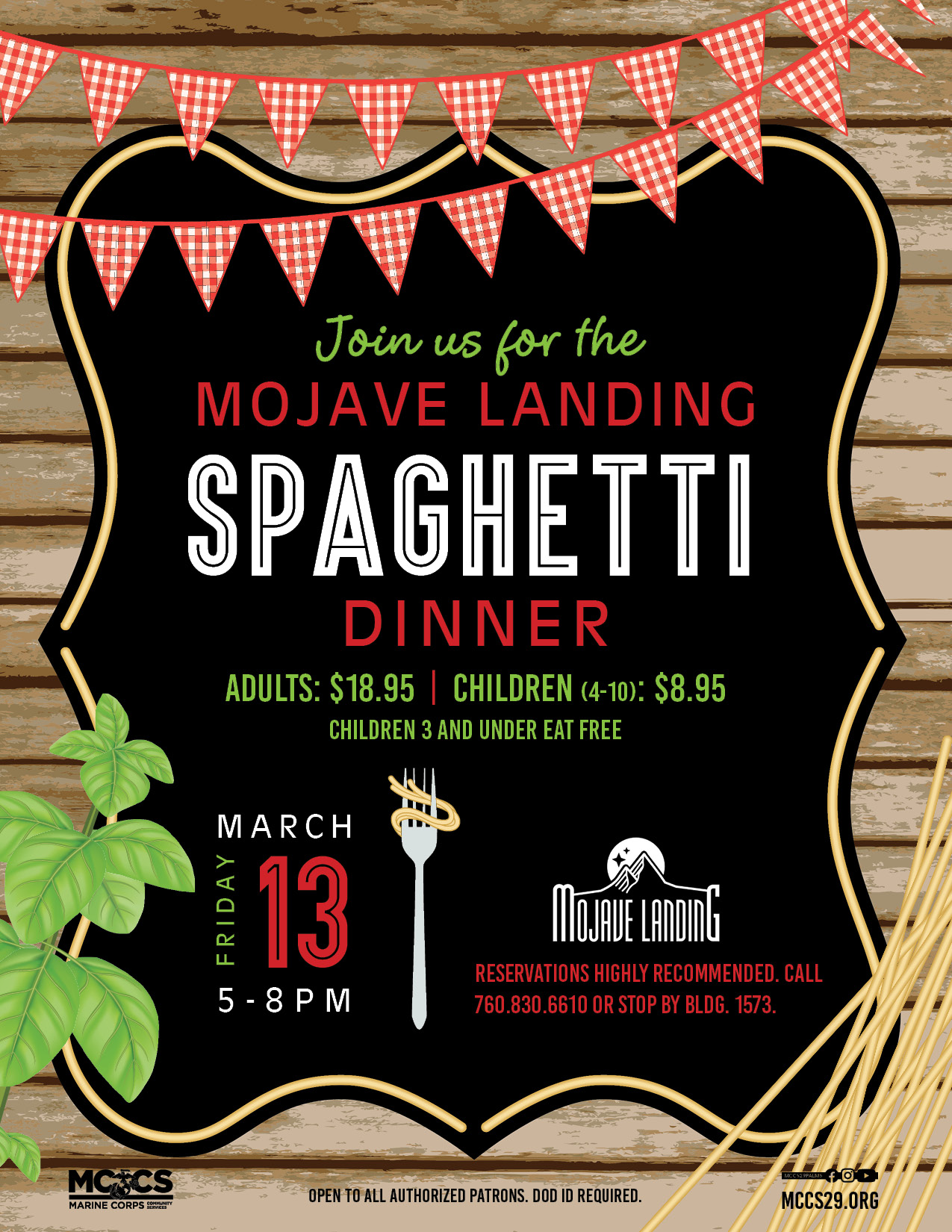Reservations highly recommended. Call (760) 830-6610 or stop by Bldg. 1573.